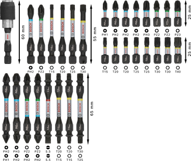 Contenuto del set: PH2 / PZ2 / T15, T20, T25, T30 / PH1, PH2 (2x), PH3 / PZ2 (2x), PZ3 / T15, T20 (2x), T25 (2x), T30 (2x), T40 / PH1-PH2 / PH2-PH3 / PH2-PZ2 (2x) / SL1x5,5 / T15-T20 (2x) / T25-T30 / Portabit universale Quick Release / Contenitore per stivaggi